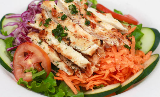 Green leaf, tomatoes, red cabbage, carrots, cucumber and topped with charbroiled chicken breast.