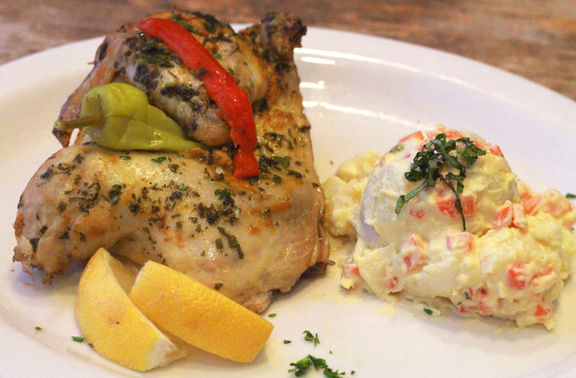 Half baked chicken. Served with fresh cut provenzal fries, papa al mojo de ajo or salad